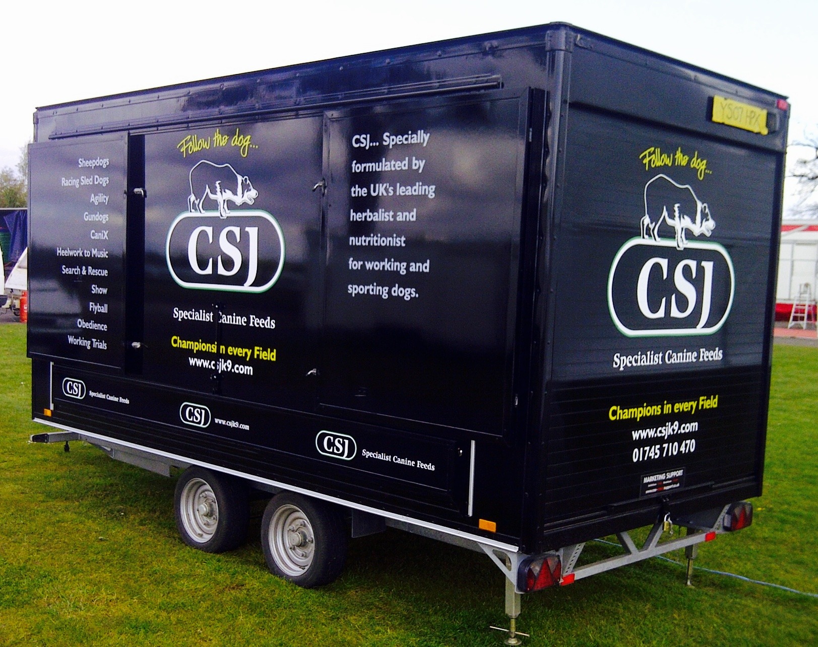 Built on a galvanised chassis with GRP walls and Riveted corner sections for added strength, insulated internal roof, opening side roof with steps leading to internal display areas with colour coordinated stat walling and display shelving Central display area to ground level , TV monitor connection point, display spot lights, galvanised roof legs, double rear personal door, internal stock or kitchen room at front of trailer, internal lighting and 240 V sockets, fold out advertisingdoors and top roof sign. So... check out our exhibition trailer sales with confidence.