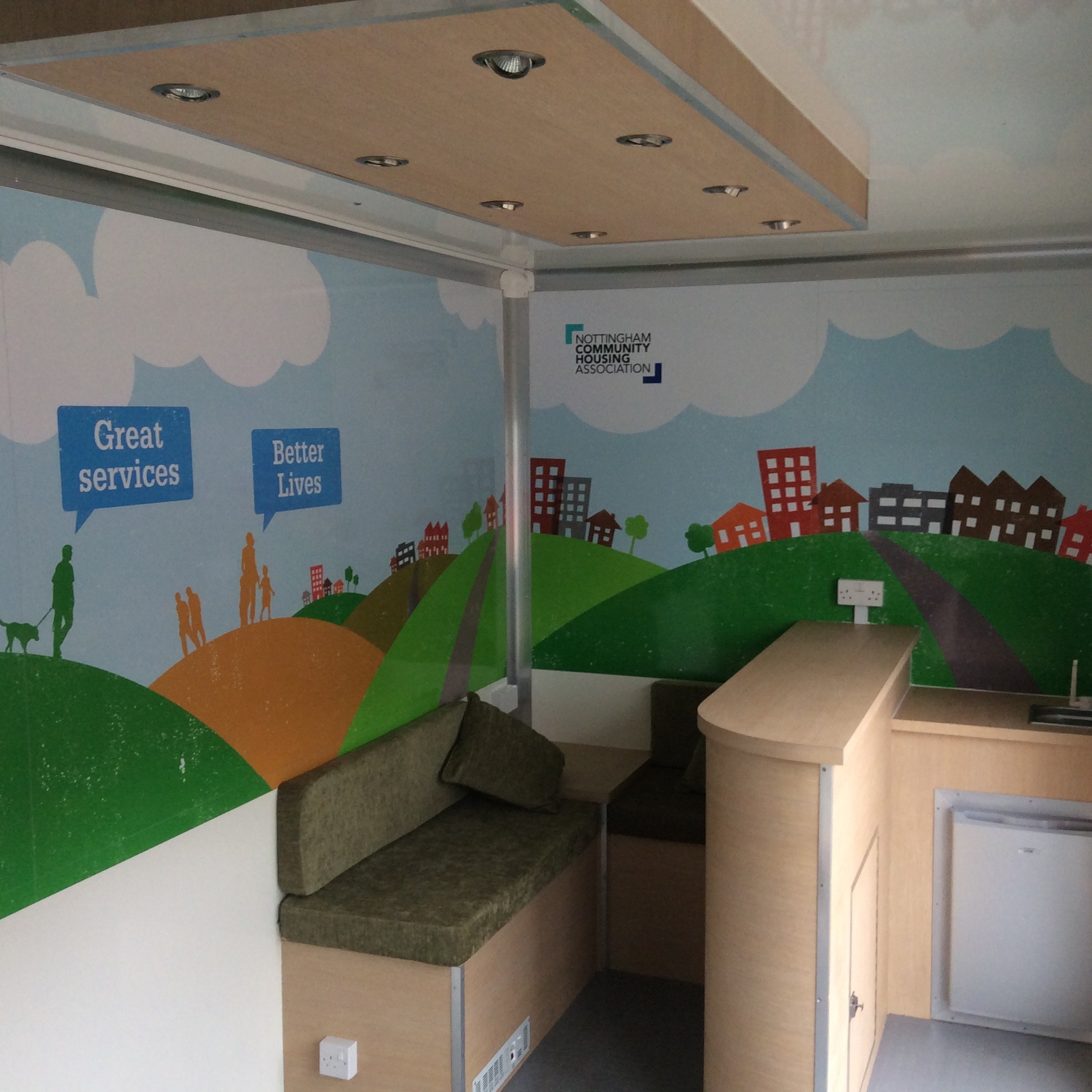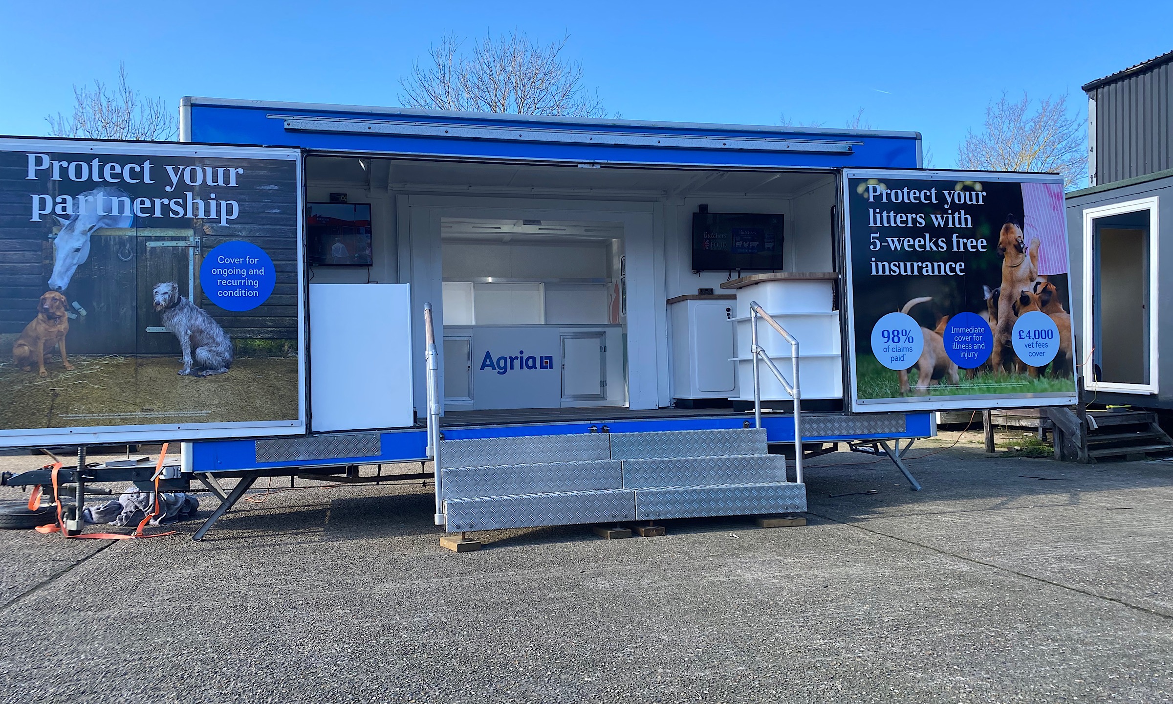 Built on a galvanised chassis with GRP walls and riveted corner sections for added strength, insulated internal roof, opening side roof doors with aluminium steps leading to internal seating and hospitality areas, ground level display wall with slat walling for brochure holders, high level TV monitor monitors, central lighting and display spot lights, rear personal door, front and rear fold out advertising doors and roof sign.
