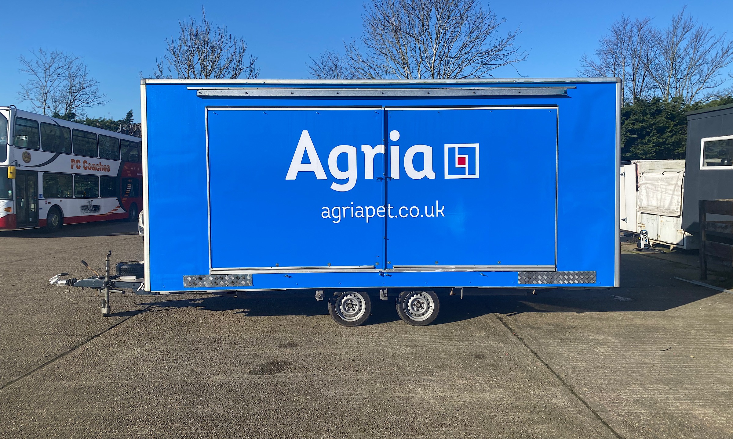 Built on a galvanised chassis with GRP walls and riveted corner sections for added strength, insulated internal roof, folding opening doors with aluminium steps leading to internal hospitality seating areas, front lower cupboards with sink unit and electrical sockets, TV monitor connection point, central lighting and display spot lights, rear personal door, front and rear fold out advertising doors and roof sign.